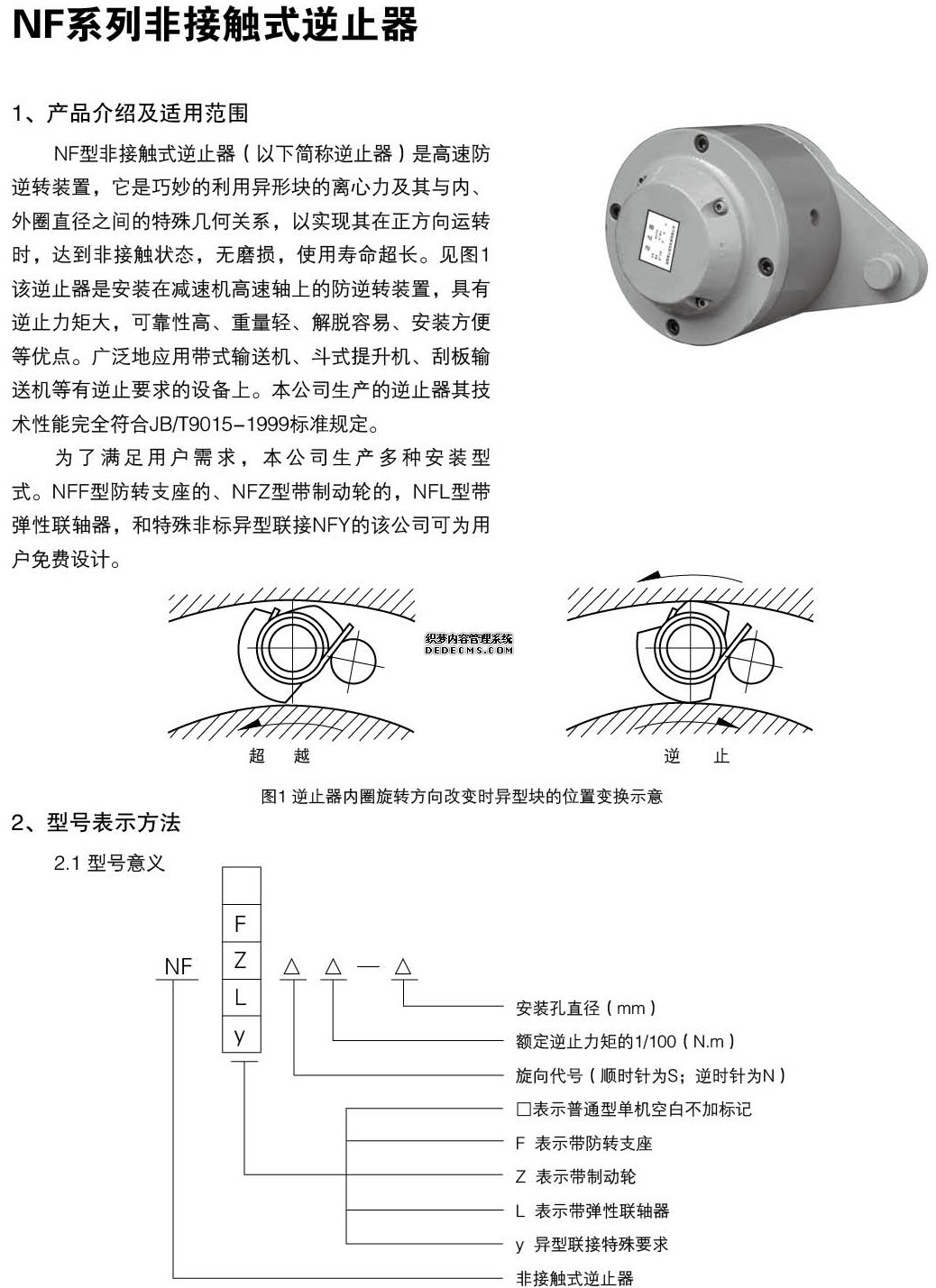 NF型非接觸式逆止器(以下簡(jiǎn)稱(chēng)逆止器)是高速防逆轉(zhuǎn)裝置,它是巧妙的利用異形塊的離心力及其與內(nèi)、外圈直徑之間的特殊幾何關(guān)系,以實(shí)現(xiàn)其在正方向運(yùn)轉(zhuǎn)時(shí),達(dá)到非接觸狀態(tài),無(wú)磨損,使用壽命超長(zhǎng)。