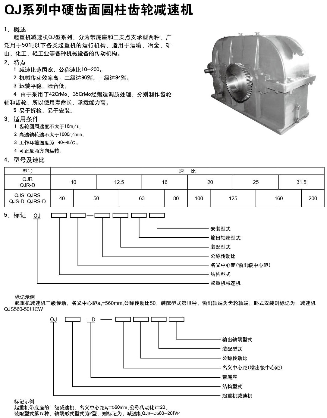 超重機減速機QJ型系列,分為帶底座和三支點支承型兩種,廣泛用于50噸以下各類超重機的運行機構(gòu),適用于運輸、冶金、礦山、化工、輕工業(yè)等各種機械設(shè)備的傳動機構(gòu)。